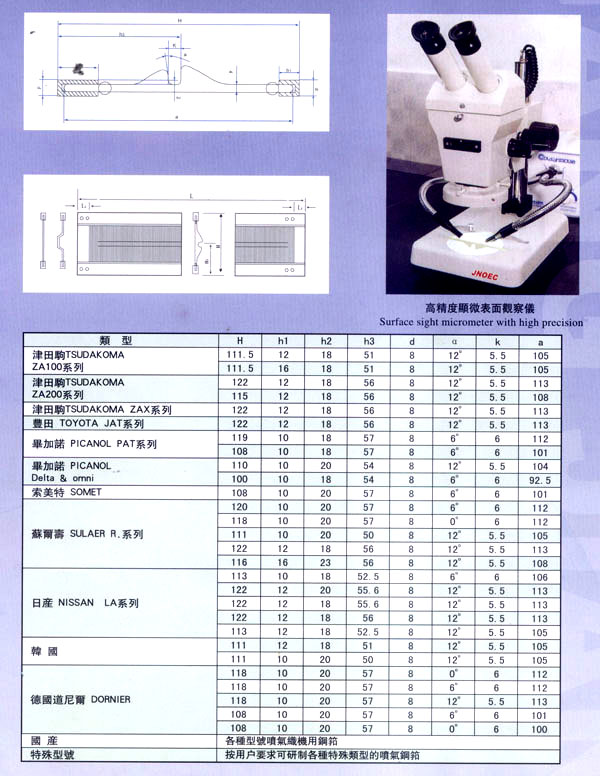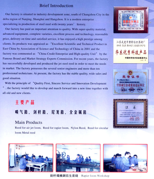 漕橋紡織器材廠位于常州市南郊寧、滬、杭金三角漕橋工業(yè)開發(fā)區(qū),是全國(guó)專業(yè)生產(chǎn)鋼筘規(guī)模較大的現(xiàn)代化廠家,已具有20年的歷史。 本廠生產(chǎn)的鋼筘有噴氣、劍桿筘、尼龍?bào)亍A織機(jī)筘和金屬筘分鉸筘、織帶筘、無(wú)梭織帶筘……本廠特別擅長(zhǎng)生產(chǎn)高密度的劍桿筘。 本廠素以質(zhì)量為重,均采用優(yōu)質(zhì)材料制筘,如噴氣筘使用的筘片膠水鋁架等,均采用日本進(jìn)口的材料;劍桿筘筘片采用日本進(jìn)口的57B線材,膠水均采用紡織部定點(diǎn)的陜西紡織研究所生產(chǎn)的優(yōu)質(zhì)膠水、高密度劍桿筘均用進(jìn)口膠水制筘;全金屬筘均用云南的優(yōu)質(zhì)錫制筘。 各種鋼筘筘面的平整度,筘齒的均勻度、垂直度,筘片的彈性度,膠水的牢固度廣大用戶使用后感到滿意放心,特別是使用壽命特別長(zhǎng),受到用戶一致的盛贊,真是料好筘好,筘好布好。 本廠為了使質(zhì)量精益求精,增添了不少先進(jìn)設(shè)備,并聘請(qǐng)了數(shù)名高級(jí)工程師和十多位具有專業(yè)知識(shí)的技術(shù)人員把關(guān)。由于質(zhì)量穩(wěn)定可靠,2001年被中國(guó)科學(xué)技術(shù)協(xié)會(huì)評(píng)為“華東優(yōu)秀科技產(chǎn)品”二00二年被中國(guó)管理科學(xué)研究院名牌與市場(chǎng)戰(zhàn)略專家委員會(huì)評(píng)為“中國(guó)誠(chéng)信企業(yè)質(zhì)量達(dá)標(biāo)單位”。 今本廠產(chǎn)品暢銷全國(guó)20多個(gè)省市,價(jià)格優(yōu)惠,供不應(yīng)求,形勢(shì)喜人。 本廠本著“以質(zhì)取勝、誠(chéng)信服務(wù)、創(chuàng)新發(fā)展”的宗旨,愿與廣大新老客戶攜手共肩,昂首走進(jìn)新時(shí)代,迎接新的挑戰(zhàn)。