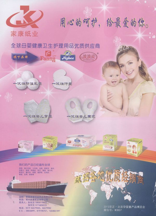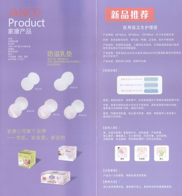 中國(guó)(JANCO)家康衛(wèi)生用品公司成立于2004年,我們專注于研發(fā)、設(shè)計(jì)、及制造健康的衛(wèi)生用品。我們的產(chǎn)品包括防溢乳墊、汗墊、寶寶背墊、圍兜、護(hù)理墊等。我們的生產(chǎn)廠房建設(shè)在中國(guó)江蘇省常州市,這是一個(gè)非常美麗的城市,并且我們的廠區(qū)鄰近沿江高速,交通非常便利。 我們擁有國(guó)際一流的生產(chǎn)設(shè)備、先進(jìn)的檢測(cè)儀器、無(wú)菌的生產(chǎn)車間。我們每一個(gè)產(chǎn)品都經(jīng)過(guò)家康人專心、專業(yè)的制造,我們注重每一個(gè)細(xì)節(jié),不斷的研發(fā)更舒適、更健康、更人性化的產(chǎn)品,旨在為您提供更滿意的服務(wù)。我們也可以根據(jù)您的需求研發(fā)、設(shè)計(jì)、生產(chǎn)不同的產(chǎn)品。我們的產(chǎn)品已遠(yuǎn)銷海外,并且得到非常好的評(píng)價(jià)。出口的國(guó)家有美國(guó)、加拿大、英國(guó)、意大利、俄羅斯、南非、泰國(guó)等。人性化的設(shè)計(jì)、優(yōu)秀的品質(zhì)、完善的售前、售后服務(wù)及合理的價(jià)格使我們的客戶與我們的合作感到非常的愉快。 我們已經(jīng)通過(guò)了ISO9000和FDA認(rèn)證,我們將感到非常榮幸能夠與您合作。 我們非常樂(lè)意與中國(guó)的經(jīng)銷商共同分享我們的產(chǎn)品,我們將非常期待您的信任和加盟。 我們將一如既往的為您提供:更舒適的、更健康的產(chǎn)品。